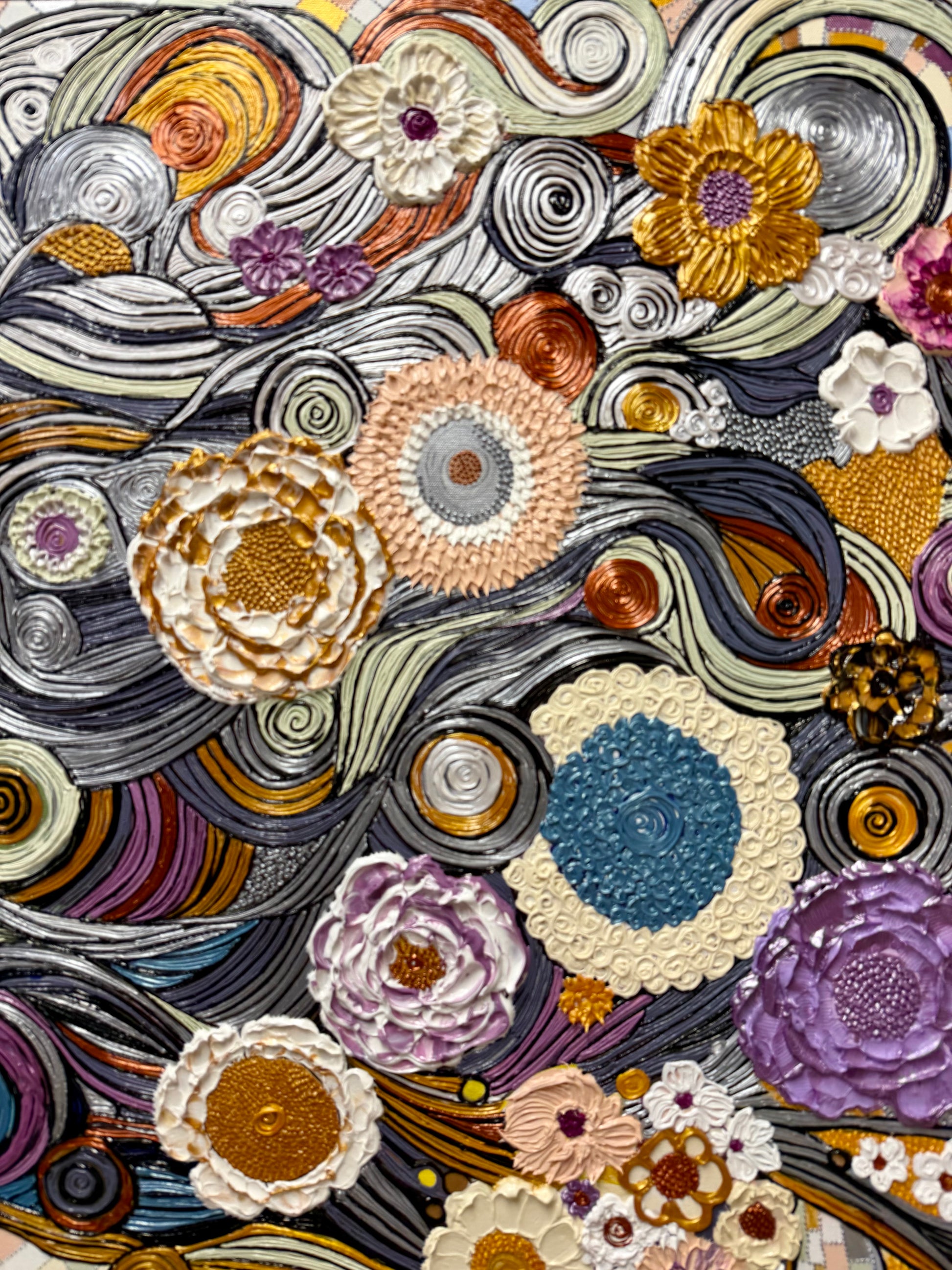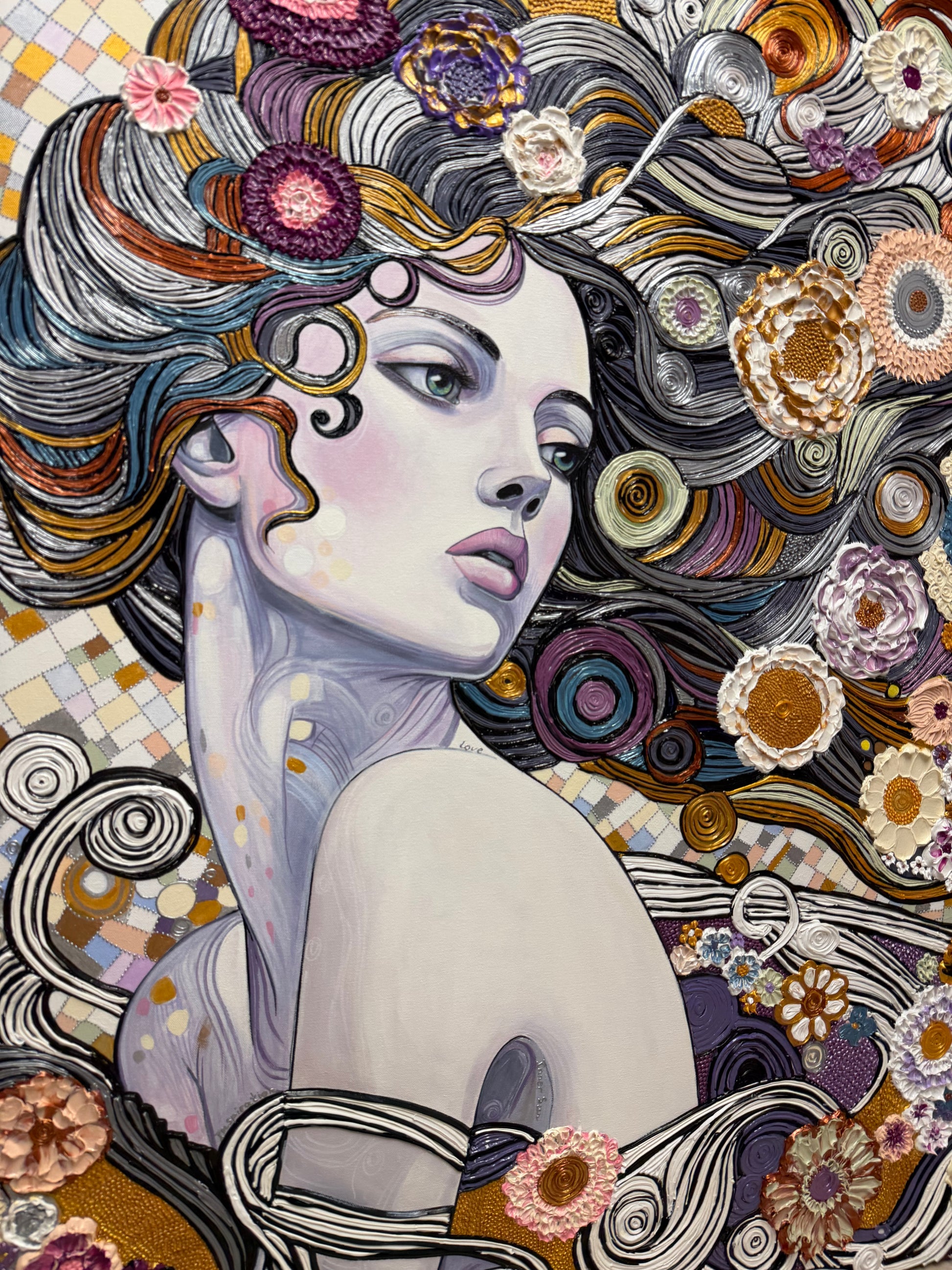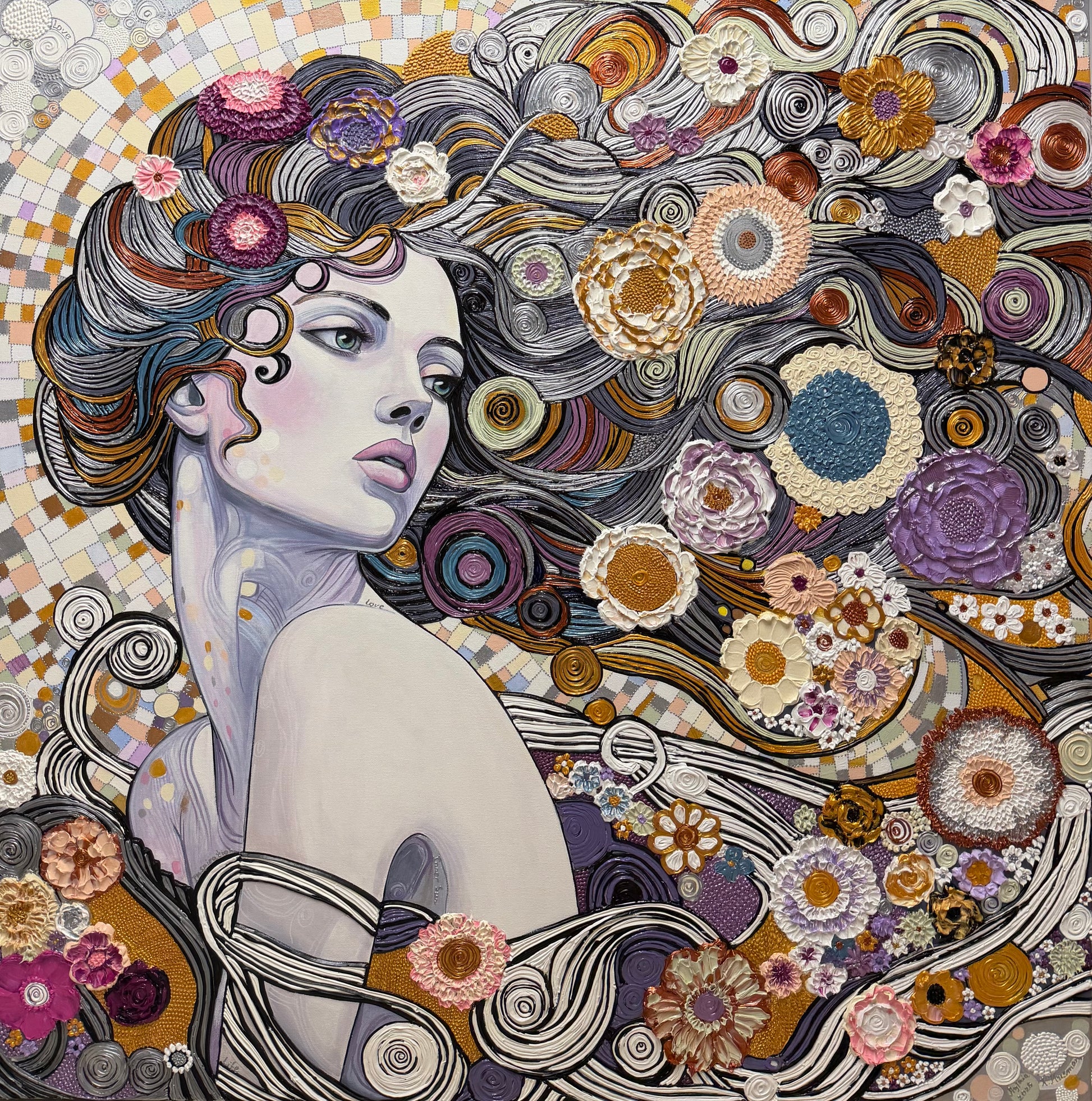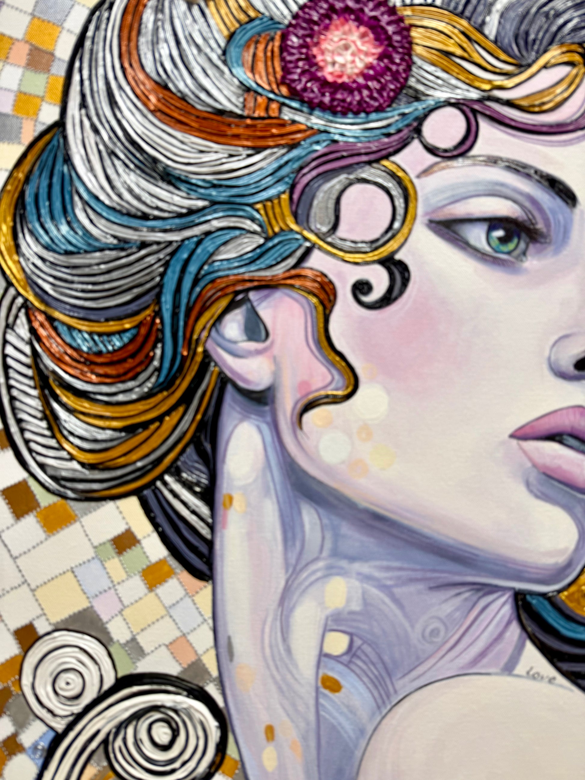 Ornaments, flowers, and golden lines grow from her like thoughts taking shape in matter. She does not wear beauty — she is its source. This painting is about the moment when art is born: when the inner light meets the fire of creation.