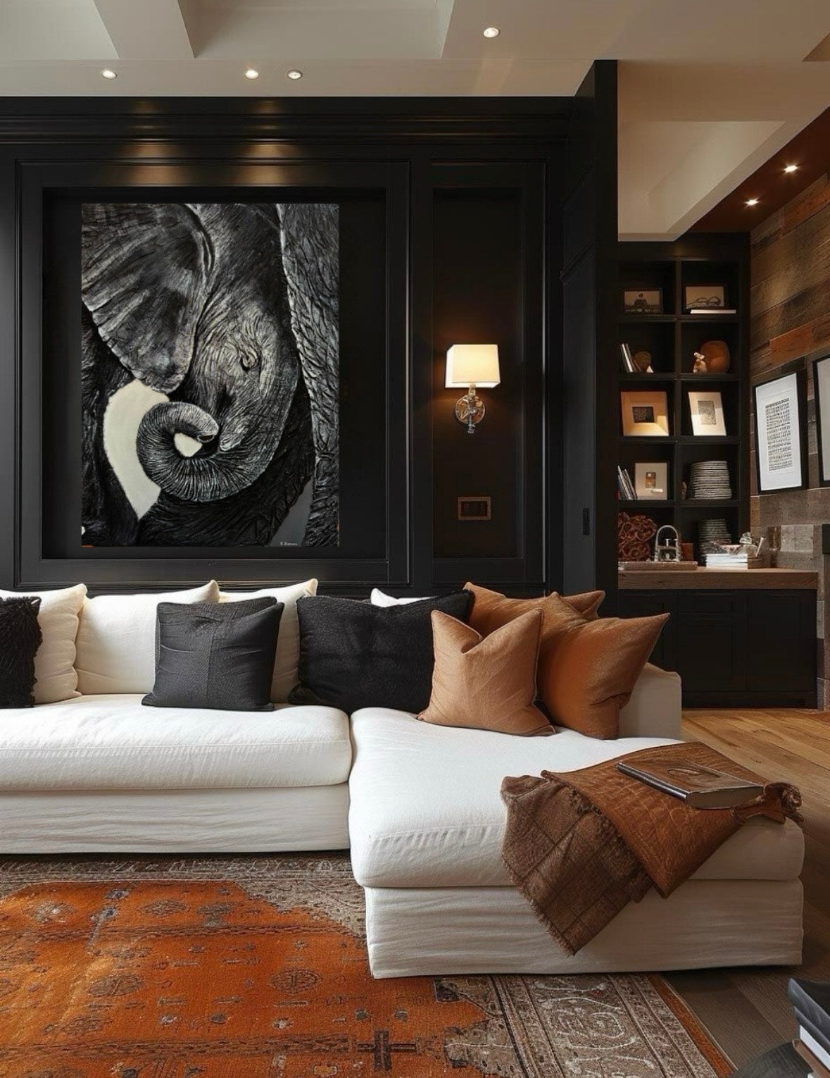 "Baby elephant & Mom" — this touching painting warmly depicts the bond between a mother and her little baby elephant. Only the legs of the mother elephant are visible, while the baby snuggles close to them, feeling completely trusting and protected. The expression on his face is happy, filled with joy and love. The painting is rendered in a tranquil, gray palette, enhancing the atmosphere of serenity and safety. Motherly love is one of the greatest values in anyone's life. It gives us not only warmth and care but also self-assurance, support in difficult times, and endless tenderness. Let each of us always remember how important it is to be close to those who love us unconditionally, like our mother.
